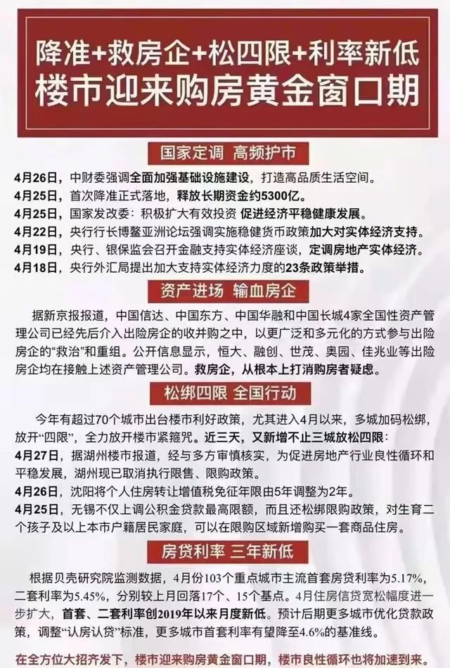 4月18日,央行释放个人住房商业贷款政策利好,提出“因城施策实施好差别化住房信贷政策,合理确定辖区内商业性个人住房贷款的最低首付款比例、最低贷款利率要求,更好满足购房者合理住房需求”, 预计接下来将有更多城市下调商贷首付比例和房贷利率,优化“认房认贷”标准,多数城市的首套房贷利率有望降至基准线4.6%,二套降至5.2%。