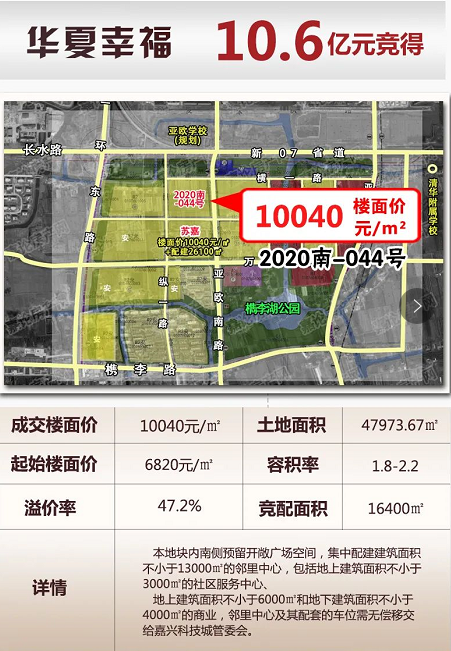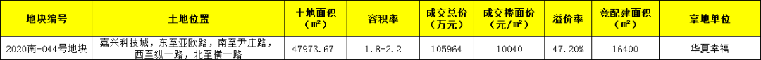 今日市本级出让一宗科技城住宅用地,地块编号为2020南-044号,经历199轮报价,以105964万元,溢价率47.2%,熔断楼面价10040元/㎡+16400㎡配建成交,被华夏幸福摘得。实际楼面价14694元/㎡(仅供参考)。