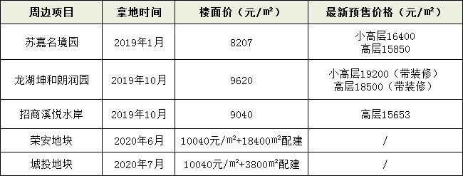 而房价上,名境园上一张预售证,小高层16400元/㎡,高层15850元/㎡;朗润园上一张预售证,小高层19200元/㎡,高层18500元/㎡;溪悦水岸上一张预售证,高层15653元/㎡。