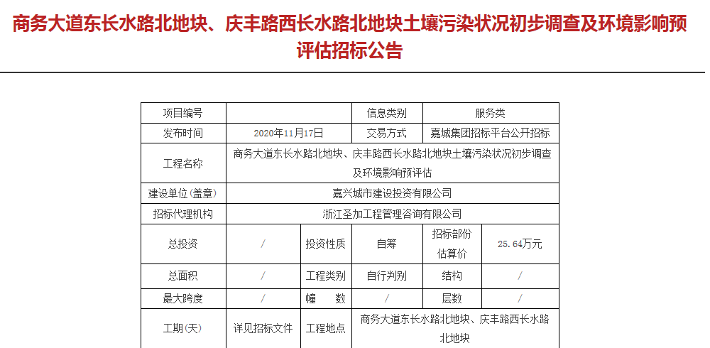 近日,嘉兴市政府官网上有一则招标公告,内容为商务大道东长水路北地块、庆丰路西长水路北地块土壤污染状况初步调查及环境影响预评估。这则招标,表明公告相应的地块有打算出让或作为某个用途。