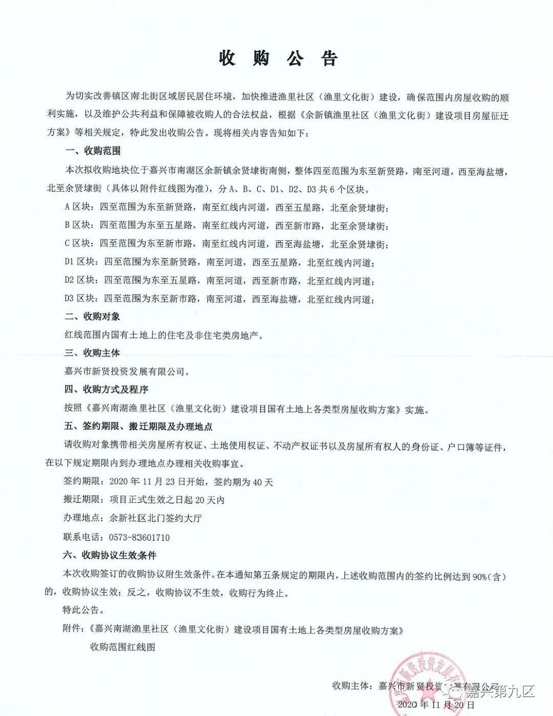余新镇余贤埭街南侧要被征收了,要建设南湖渔里社区。签约从11.23开始,签约期为40天