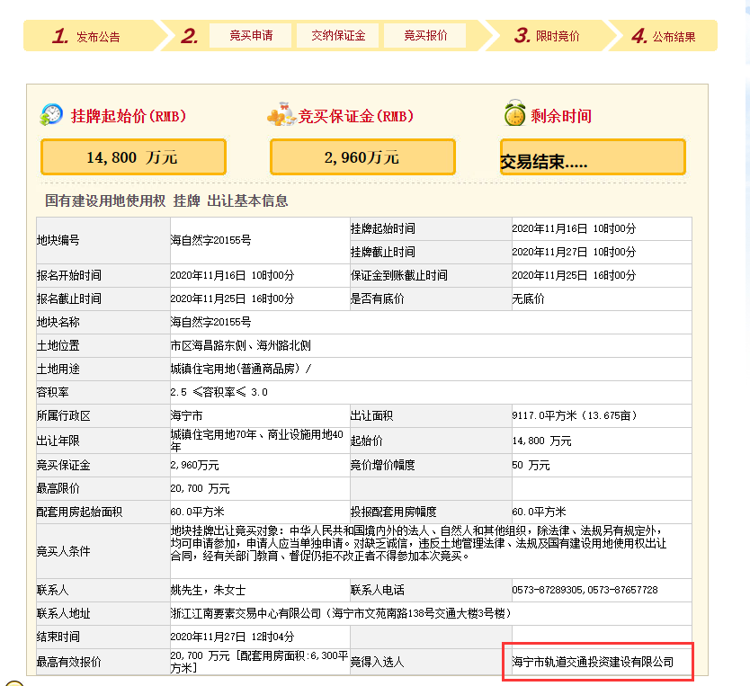 海宁市轨道交通有限公司摘得,楼面价7568元/㎡+配建6300㎡!