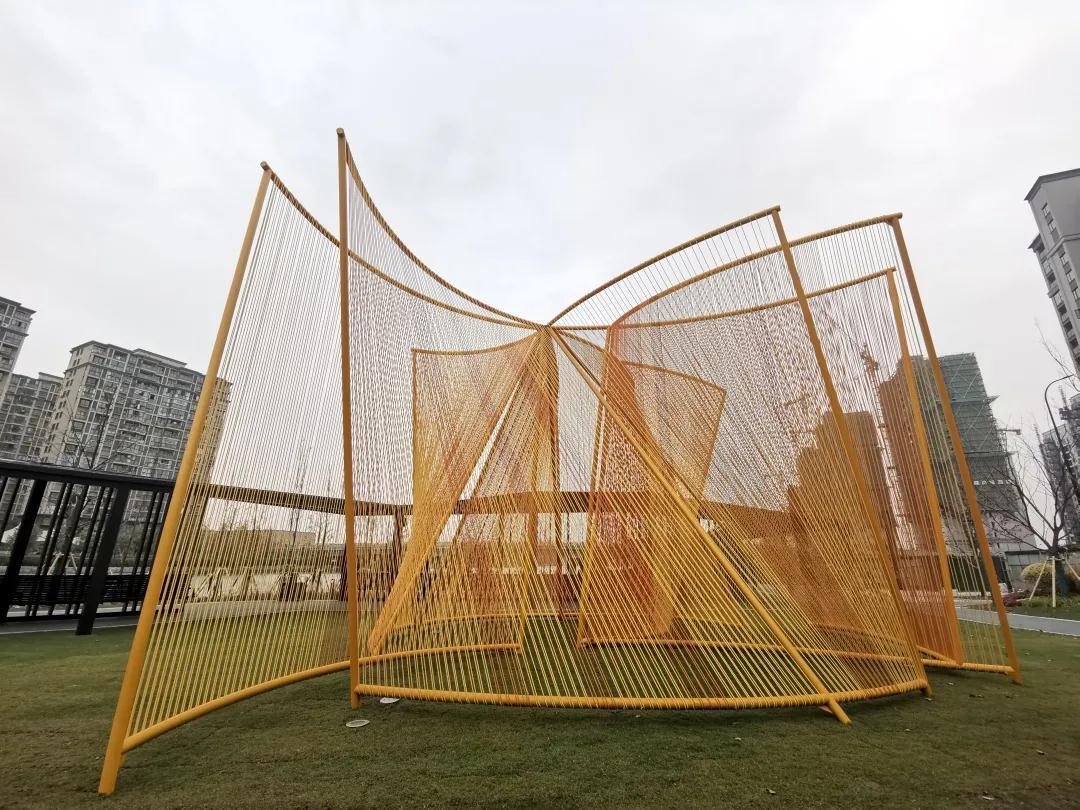 创意源自于对嘉兴城市地理特点的艺术描摹,九条河流抽象化地向上盘旋伸展;穿过连廊看到的是一处水景,水面“飘着”的雕塑名叫“叶语”,是用高分子材料3D打印,造型运用重叠、旋转手法,用简洁的语言表达了叶、水、光、影的元素。