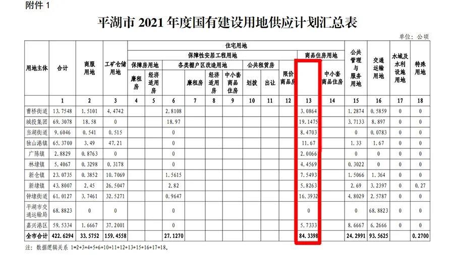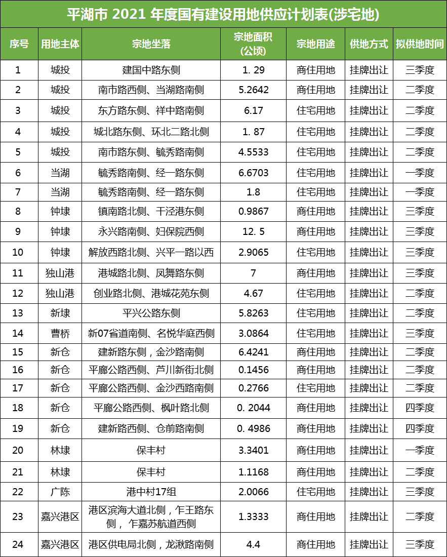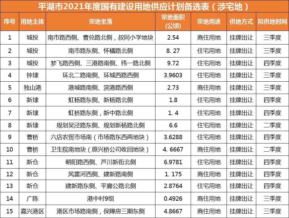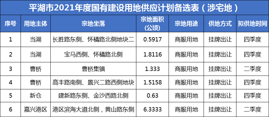 《平湖市 2021 年度国有建设用地供应计划》总量为 422.6294 公顷(折合 6339.44 亩,其中嘉兴港区 893 亩);另备选涉宅地共15宗,供应面积61.70公顷。