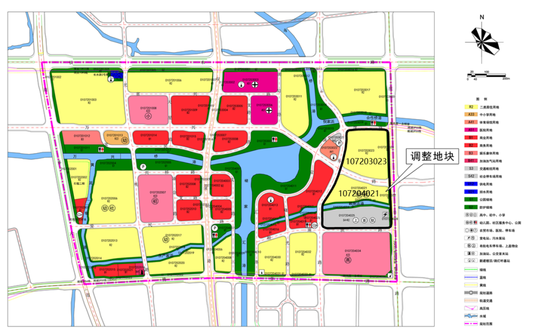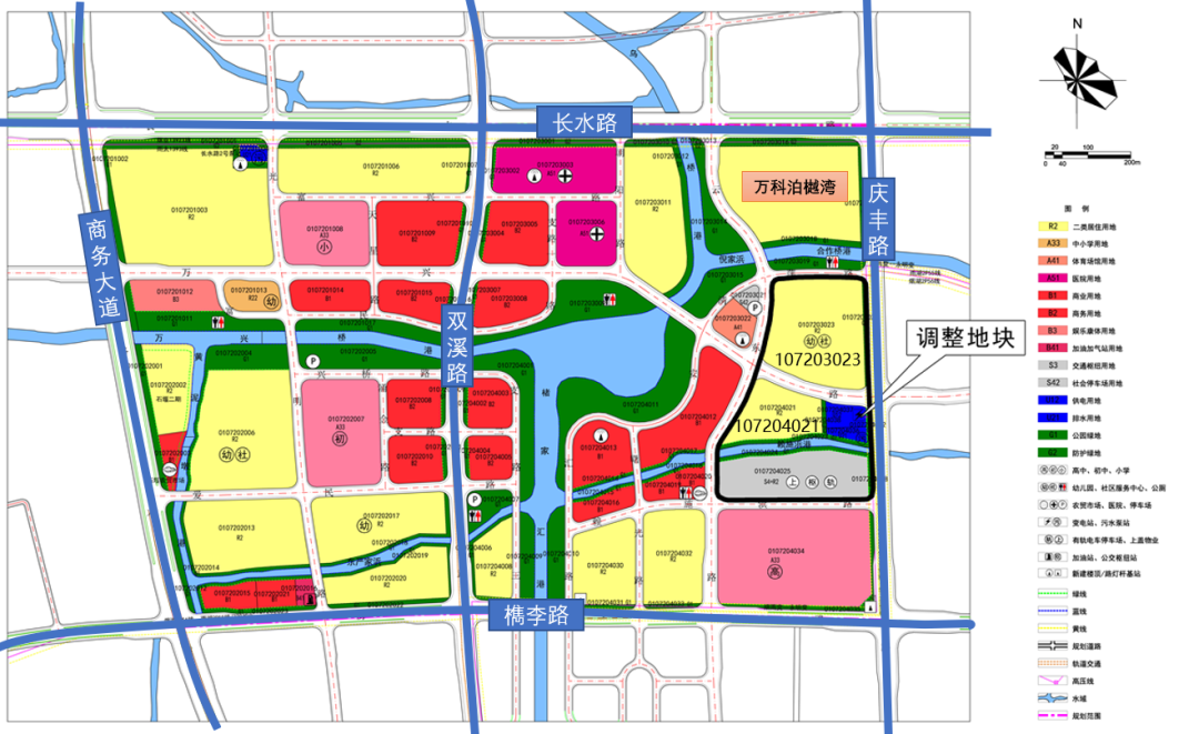 涉及用地规划修改的,主要是编号为107204021号和107203023号地块,均位于万科泊樾湾南侧。107204021号地块修改后无须配建幼儿园和社区服务中心,107203023号地块,修改后须配建12班幼儿园和社区服务中心。