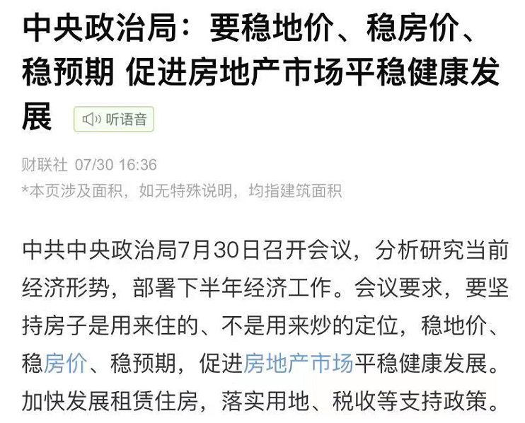 730会议,中央再一次明确,要稳地价、稳房价、稳预期,促进房地产市场健康平稳发展,坚持房子是用来住的,不是用来炒的定位。